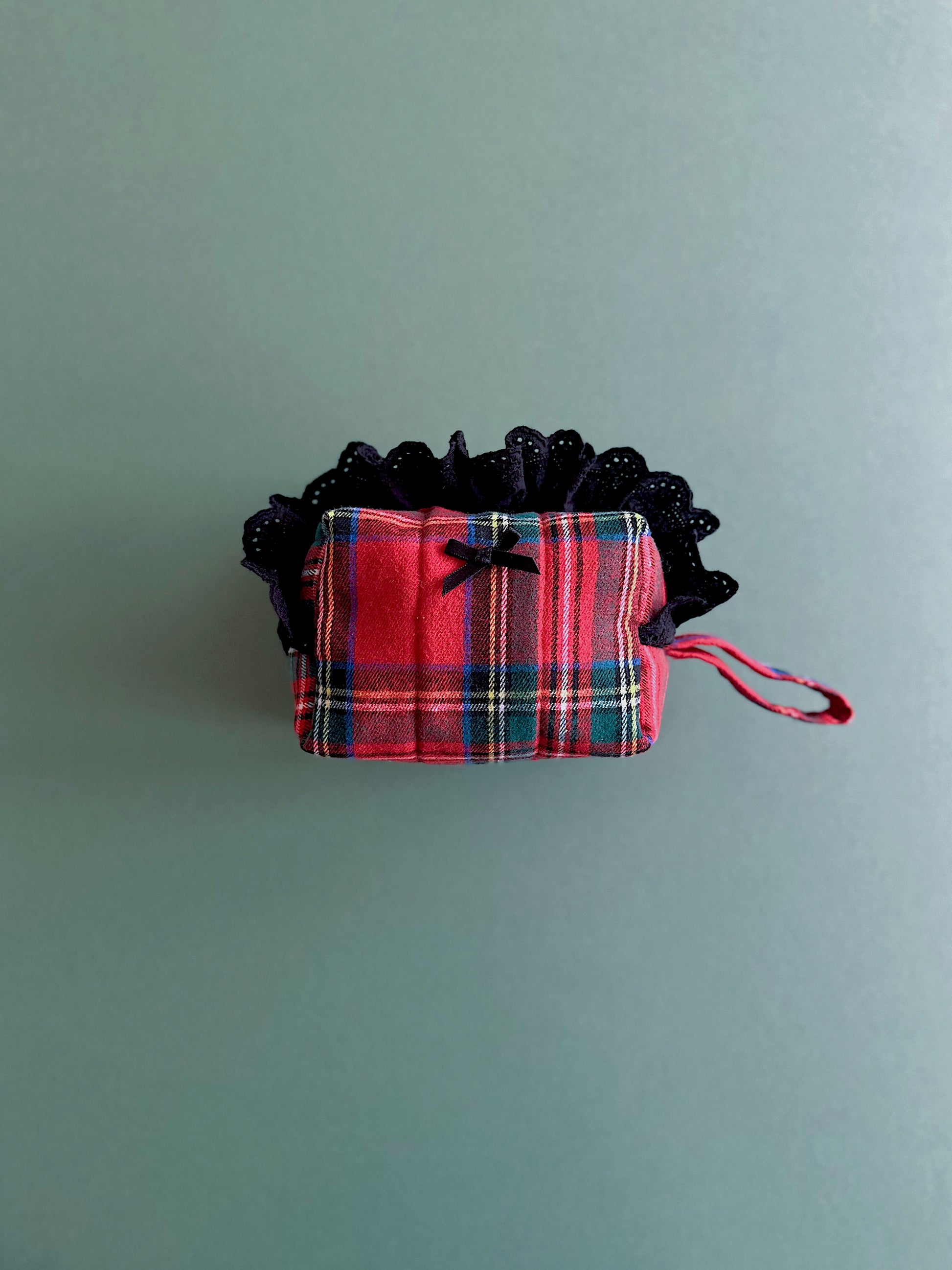 Each pouch features a classic Christmas red tartan fabric, lightweight yet durable, and finished with an adorable velvet bow.